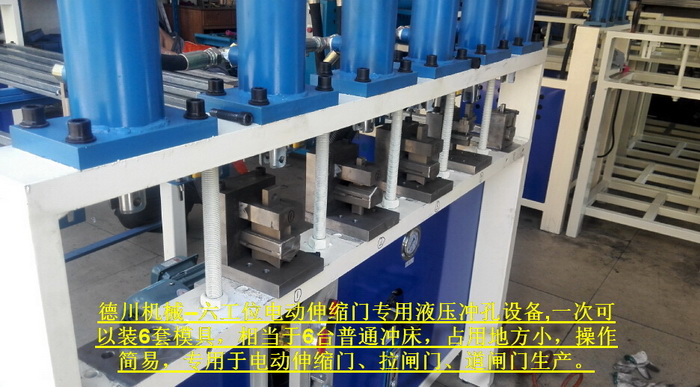 六工位電動伸縮門專用液壓沖孔設備,一次可以裝6套模具,相當于6臺普通沖床,占用地方小,操作簡易,專用于電動伸縮門、拉閘門、道閘門生產。...