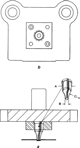 主體直徑a遠大于沖裁直徑B;半徑C提供支撐材料,以提供剛性,并防止沖頭在接觸材料帶時發(fā)生偏轉。剖面圖a顯示了沖頭、沖頭板和沖頭支架,它們將出現(xiàn)在整個模具圖紙的左下剖面圖中。